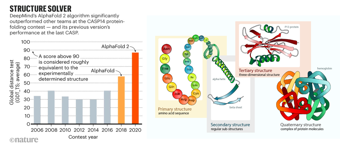 AI had its moon landing moment in biology in 2020 when it effectively solved the problem of predicting protein folding based on the genetic sequence. As described in prior sections, researchers have spent half a century experimentally identifying 3D protein structures by crystalizing them and then shooting x-ray beams at them. Taking roughly five years of PhD work per protein, those one million PhD years yielded a dataset of nearly 200K solved proteins by 2020. DeepMind spent five years developing a deep learning algorithm trained on that dataset that in 2020 approached accuracy levels considered equivalent to experimental work. They used it to predict the structure of all 200M proteins – or, one billion years of PhD work, and then released the dataset to the world for free. The European Molecular Biology Laboratory’s European Bioinformatics Institute deemed 35% to be highly accurate — as good as experimentally determined structures — and another 45% accurate enough for some applications. More than 1.2 million researchers from more than 200 countries have now accessed AlphaFold to view millions of structures.