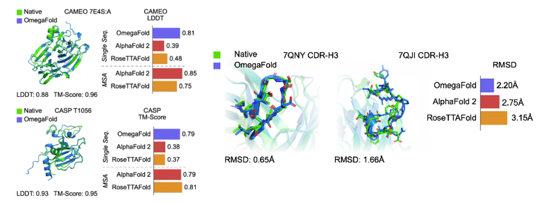More recent tools have attempted to eliminate the need for MSAs in their predictive models by using language modeling applied on individual protein sequences (Figure 1). For example, OmegaFold3 has a language modeling component called OmegaPLM that uses transformers and attention mechanisms to learn per residue and residue-pair representations for each sequence of protein. OmegaFold3, along with other single sequence based models such as HelixFold-Single4 and Meta’s model, called ESMFold5, have higher potential in predicting structure of orphan proteins and antibody design, as they don’t require MSAs as their input. However, they have lower general accuracy for proteins with MSAs compared to AlphaFold2 and RoseTTAFold. In contrast to MSA-dependent models, the domain of applicability for language model based approaches may extend beyond naturally-occurring protein sequence for structure prediction - this may include mutated protein structure prediction or protein engineering tasks. (link)