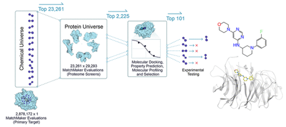 - MatchMaker is a machine learning model trained to predict ligand-protein interactions, identifying potential binding between any small molecule and any protein in the human proteome. The model is particularly powerful in that it can make these predictions even with low or no data on a given protein target, because it relies on the structure of individual protein pockets, rather than that of the entire protein. As an AI-enabled platform trained on millions of known ligand-protein interactions, MatchMaker can also be used to learn biophysical patterns of proteins and ligands, adding chemical insights and improving our ability to predict a drug’s mechanism of action. (link) Here are Recursion’s studies: 1,2