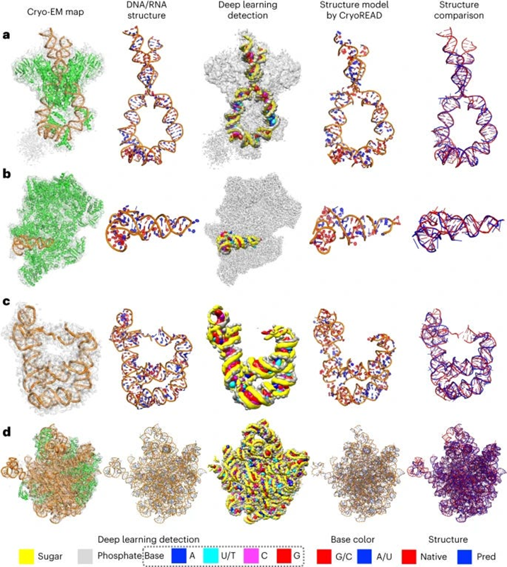 - The authors of this paper developed CryoREAD, an automated de novo nucleic acid atomic structure modeling method based on deep learning. The system works by identifying phosphate, sugar, and base positions fundamental to nucleic acid structures in a cryo-EM map with deep learning and then modeling that into a 3-D structure. The sugars are connected to form a backbone and the nucleic acid sequence is projected onto that. The system was tested at the 2-5 Å resolution, medium-scale resolution. They found that 85.7% of atoms were placed correctly within 5Å and 52.5% of nucleotides were correctly identified. The authors also tested their CryoREAD model against existing software that is mainly used for protein reads but is often adapted for understanding nucleic acids. While limitations of nucleotide sequence prediction need to be addressed, this work presents a foundation for DNA/RNA structure modeling without manual human input. This can help fill a fundamental tool gap in structural biology and modeling. (link)