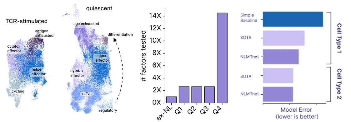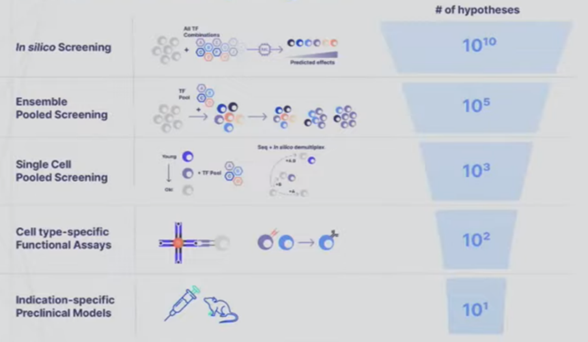 - A startup founded to cure aging called New Limit combines many of the tools detailed in the sections above to create a learning feedback loop that perfectly exemplifies the cutting edge of experiment design. They’re looking to figure out which transcription factors (TF) can epigenetically reprogram the age of a cell to a younger state without impacting anything else. Intuitively, it seems feasible to isolate age since we can already use TFs to reprogram cells to turn into different cell types (e.g. a skin cell to a lung cell) and we can reprogram both its age and its type. The tricky thing is that the combinatorial space of all possible TFs is far larger than could ever be done in the lab by perturbing a cell with a TF and seeing what happens to the cell. There are 1,700 transcription factors in the human body. Even assuming we’re smart enough to narrow that down to 400 ones that are likely to be useful for the company’s purposes, there are still 1010 combinations of 5 TFs out of 400. The traditional way of scanning a large space is to put old cells in individual test tubes, introduce the intervention, and record the results. New Limit uses advances in functional genomics to take a pool of old cells and deliver a pool of perturbations, each one getting a random combination of TFs. This allows for hundreds of thousands of combinations in a single dish where every cell represents a different experiment. But, they’re all clumped together. To figure out what actually happened, they first DNA barcode each TF perturbation. They then measure how the cell was affected not just by analyzing that one gene but by using single-cell genomics methods and ensemble chemistry to analyze all the genes in its genome, the accessibility of the genes in the genome, the proteome, etc. as well as cell type-specific phenotypes (e.g. if it’s an immune cell, does it divide and differentiation in response to a threat). They’re combining this high-throughput wet lab approach with a machine learning platform that helps them predict the effects of unseen perturbations to help determine which experiments will be most fruitful to run. These models use humanity’s understanding of TFs, the starting state of the cell, and New Limit’s prior experimental data. Very early in this feedback loop, they’ve began to map out the TF space, test experimentally 6x more TF combinations than had previously been tested, and create AI models that outperform the prior state of the art.