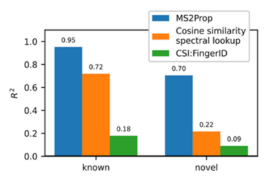 - Using transformers, we built MS2Prop: A machine learning model that directly predicts chemical properties from mass spectrometry data for novel compounds. In other words, the model predicts chemically relevant properties of compounds for drug discovery directly from mass spectra, without relying on an actual or predicted structure. As such, we can generate predictions independent of whether the compound is in an existing database. MS2Prop performance has an average R2 of 70%, meaning its predictions explain about 70% of the variation in properties from structure to structure (see preprint for list of all 10 properties) for novel compounds. This is in contrast to an R2 of 22% for the default method of looking up the closest spectral match in a database and calculating the properties from that molecule or an R2 of 9% using CSI:FingerID, a publicly accessible tool which combines fragmentation tree computation and machine learning. We show performance gains across key properties like synthetic accessibility (addressing Problem #3 above), fraction of sp3 carbons, or quantitative estimation drug-likeness (QED).