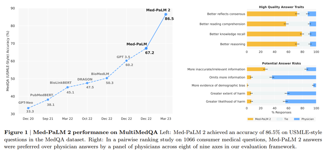 Google’s making progress on the latter vision. A research scientist in the Google Health division gave a talk at a recent conference on their new medical-specific model Med-PaLM 2 designed to answer medical questions with maximal accuracy and safety. It’s the first LLM to perform at an “expert” test-take level on US Medical Licensing Exam questions and to pass India’s AIIMS and NEET medical exams. In the study, human physicians rated Med-PaLM’s answers better in many cases than other humans’.