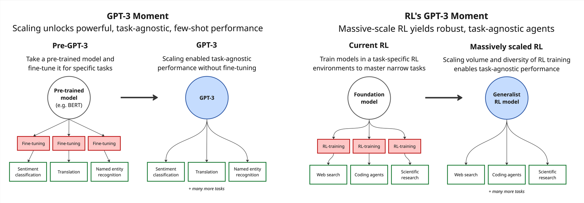 Everything starts with pre-training. Performance on long duration tasks, rapid adaptability to new tasks, and data efficient learning are all directly proportional to raw intelligence. GPT-3 was the first model capable of few-shotting relevant tasks without fine-tuning. As the base models keep getting more all-encompassing, they’ll be able to few-shot ever-more such that the continual learning discussed later is unnecessary.