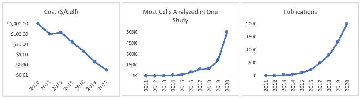 All this work developing new instruments and methodologies means that the cost per cell fell by 100,000x in 10 years and the throughput by several-million-fold, as seen in the graph below.1