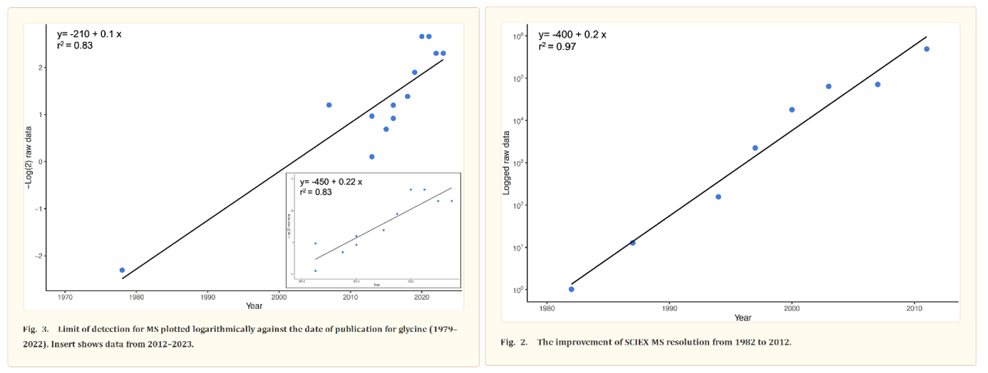 The most common way to identify proteins in mixtures is called tandem mass spectrometry (MS/MS). In MS/MS, proteins are first digested into peptides using enzymes like trypsin. The resulting peptides are then analyzed in the mass spectrometer. The instrument measures the ratio of the peptides’ mass to its charge (m/z) and then fragments them to obtain their amino acid sequence. The precision of these machines has been improving at around the pace of Moore’s Law for over forty years, as detailed by this review. Protein identification is achieved by matching the observed peptide mass and fragmentation pattern to a database of known protein sequences.