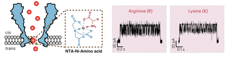 Possibly the most promising attempt yet to bring the combined throughput and reliable accuracy of nucleotide sequencing to proteins was put forth just weeks ago in a proof-of-concept demonstration. The group developed a nanopore-based technique to identify proteins. All 20 amino acids and some post-translational modifications (PTMs) could be discriminated through a nanopore engineered with a nickel ion on the inside of the channel (image below, left). As each amino acid passes through the channel, it changes the potential of a voltage applied across the membrane (image below, right). A machine learning model was trained on the current traces and achieved 98.6% accuracy in classifying amino acids.