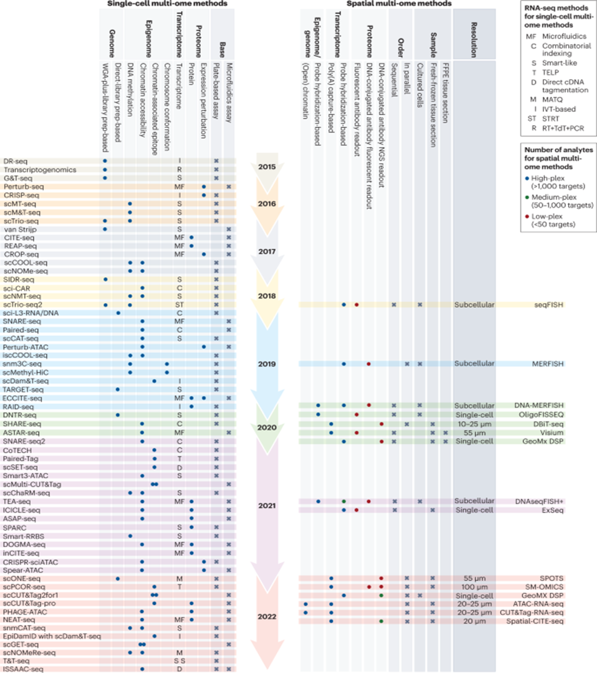 Here’s where it all comes together, pun intended. As researchers dissecting the transcriptomic heterogeneity of single cells and uncovered entirely new cell types or identities, they increasingly realized that combining scRNA-seq with other types of data points provides information that’s more than the sum of the parts. Researchers have devised methods to explore all the possible combinations of 2-3 omics data points at the same time. Per Robert Stickels of Broad Institute’s genomics department, "Soon there will be technologies that give you more and more types of data all together at the same time, spatial information, RNA, DNA, chromatin, protein, temporal information about cellular histories, metabolite profiling, you name it, at single-cell resolution."1