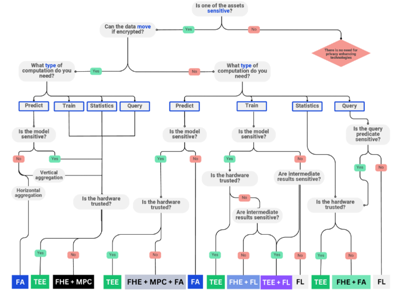 Given that each protocol has its own security vulnerabilities, design tradeoffs, and speeds, teams looking for privacy solutions will generally combine multiple approaches, as explored in the decision tree graphic below. Thoughtful architectural design can ensure independent vulnerabilities such that if a ZK protocol and TEE both have 1 in 1 million chances of being hacked, then leveraging both technologies together can reduce the likelihood of hack to as low as 1 in 1 trillion. Importantly, the performance drag from combining multiple protocols can be contained by cracked engineering.