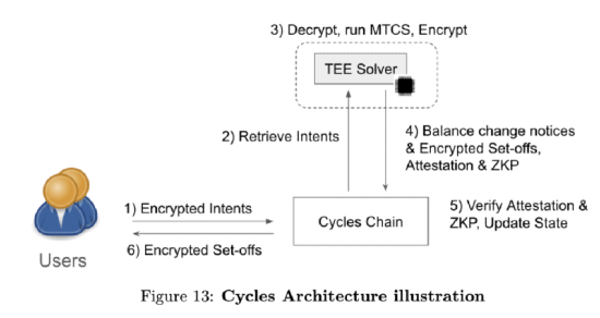 In regular intervals, the encrypted intents are fetched by a ZK-TEE system that decrypts them into the corresponding graph. The graph algorithm finds the settlement solution that discharges the collective debt with the least capital. The solution is encrypted and a ZKP is generated that validates the correctness and integrity of the graph algorithm’s output. Both are then submitted back to the blockchain, at which point all the debt accumulated in that interval is settled in a multilateral atomic settlement, and the users see the final results.