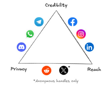 Social media platforms today can address two of the following: proving your identity/credentials, reaching large audiences, and a controllable degree of privacy.