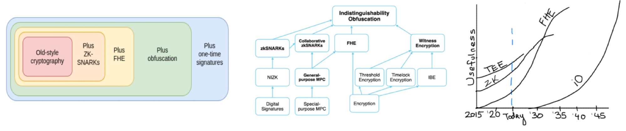 Finally, these technologies are coming in waves, moving us in swells towards increasingly generalized programmable cryptography. Special-purpose cryptography has been viable for decades but for very narrow, static tasks → TEEs have been viable for general-purpose private compute for years but have known security exploits → ZK is currently arriving but can only handle single-party private computations → FHE generalizes that to handling any kind of privacy-preserving compute but is still several years out from being viable for complex applications at scale and has some liveness and security drawbacks → indistinguishability obfuscation is the cryptography Holy Grail as it has full black box general-purpose computing capabilities with near perfect security guarantees but is decade(s) out.