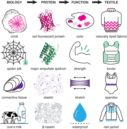 A parallel evolution to that changing how the products listed above are made is happening with consumer products. These efforts are also being made to reduce emissions and transition away from oil- and animal-derived products. After all, our current faux leathers called “pleather” are made with plastics. Alongside these reasons, research into bio-based textiles is propelled by the possibility of inventing new materials with improved performance characteristics. Companies like Spiber are manufacturing spider silk at scale, a material with unique strength for its weight and that can’t be made like traditional silk because spiders will eat each other when in close contact. Finally, other companies like Gingko are looking to replace the sometimes shockingly inefficient production processes of dyes and fragrances. As an example, a red dye called carminic acid used in food products like Air Heads and Yoplait yogurt is made by smashing up 70,000 cochineal bugs to yield 3 oz of the dye. Scientists grew the dye directly by reserve engineering the bug’s enzymatic pathway and then mimicking it in engineered microbes.[1]