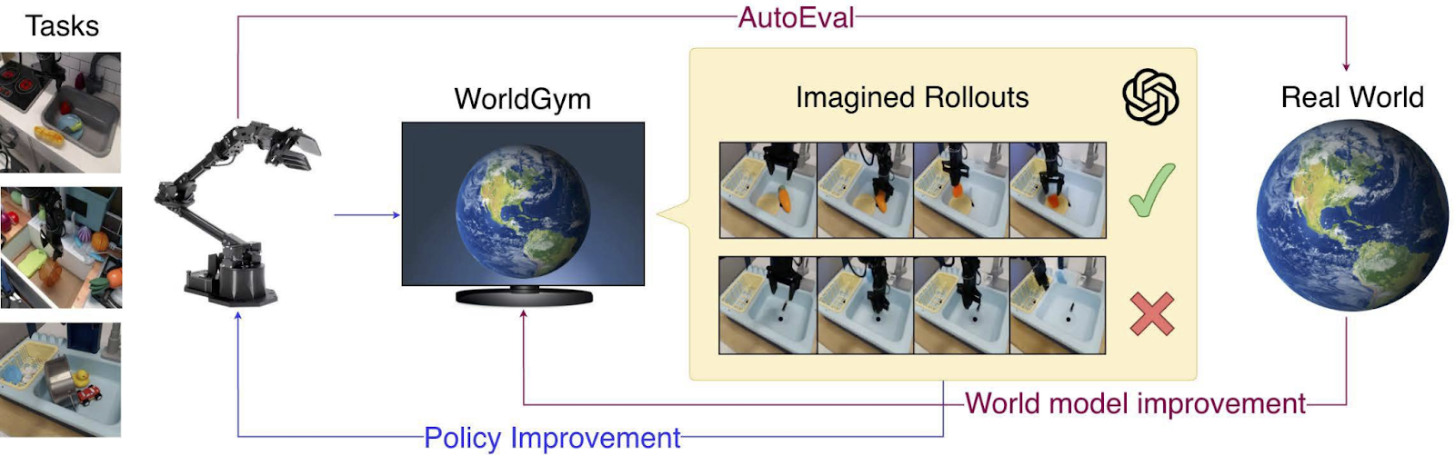 Other exciting work include DeepMind using world models to accurately evaluate generalist policies, using RL within a world model to fine-tune a policy and trying test-time training on novel scenes; a chain-of-thought method for generative video reasoning which could be extended by doing the reasoning entirely within visual-physical simulation without any language scaffold; and Nvidia’s Cosmos Policy which has no inverse dynamics model, no action head, and only the single video world model.