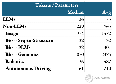 Language models also stand out as requiring far less data for a given level of parameters or compute. The Chinchilla optimal recipe suggests a compute optimal tokens:parameters ratio of ~20, though almost no large models follow that advice. Even still, they’re often a nearly an order of magnitude less data hungry than other domains’ models.