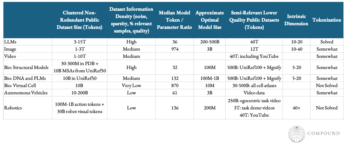 All told, language and visual modalities sit in quite privileged positions as seen below. Most technical subdomains lie firmly in the data poor regimes and often have far lower information density. So, the core struggle for companies in these spaces is building a data engine that can cheaply scale.