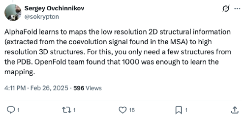 - OpenFold demonstrated that training on a clustered subset of just 10K diverse chains yields accuracy comparable to training on the full PDB, implying that the "effective" size of the structural universe is small. And, ~90% of its final accuracy was achieved in just the first ~3% of training compute time.