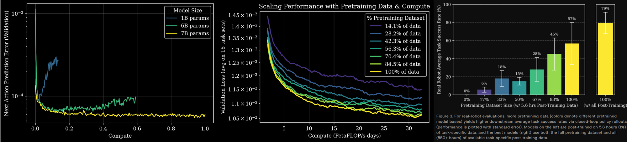 Late last year, Generalist reported the first clear evidence of scaling laws within robotics and that for the first time practically any relevant data will make the system better at each individual task. They pre-trained a VLA on their large real-world dataset generated with their UMI gripper using next action validation loss and showed that scaling pre-training reliably benefited downstream task performance.