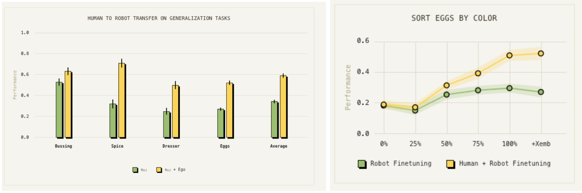 Meanwhile, Physical Intelligence showed the first glimpse of an emergent behavior from scaling. They fine-tuned their base VLA on human egocentric data and were surprised to find that it improved generalization on tasks not seen in the robotics pre-training data by as much as 2x. Upon examination, they found that models with small scale or no pre-training represented data from robots and humans with very different features whereas larger models aligned more closely similar demonstrations regardless of embodiment. This result shows that just as with LLMs, scaling robotics pre-training effectively should allow teams to utilize ever more types of data and crucially cheaper and more abundant data sources.
