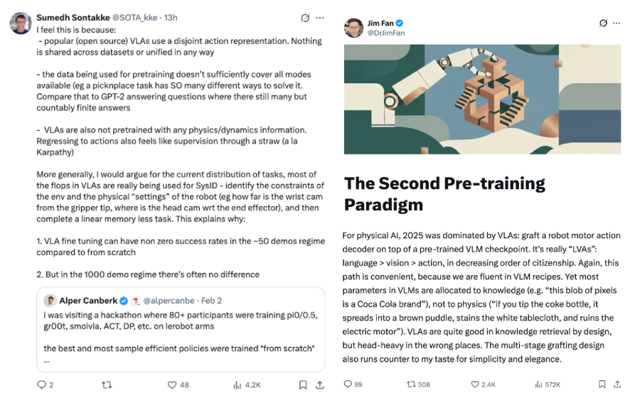 While VLM-based VLAs remain the most popular architecture amongst the various SotA training methods, we believe they aren’t the end all be all. As top researchers have pointed out, they’re more like a language-vision model with action grafted on at the end, don’t natively model cause-and-effect in the physical world, and thus regressing to actions is like sucking supervision bits through a straw.