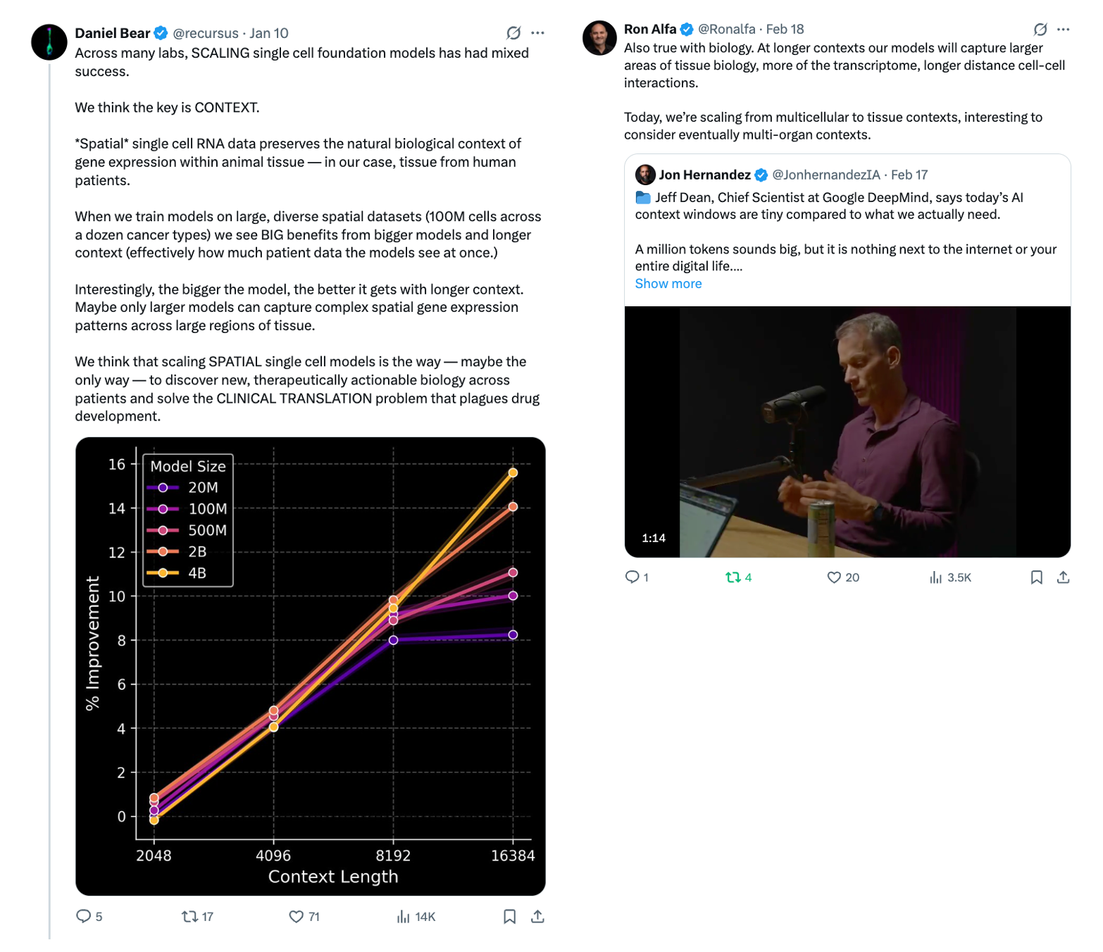 - Current technology only sequences at a depth of 10-20k UMI and dissociated single-cell RNA data possibly isn’t all that interesting for downstream applications as it misses the important variance a large model could capture