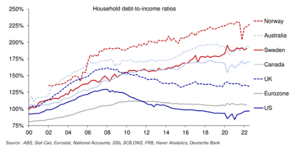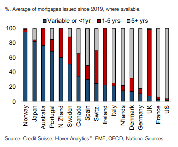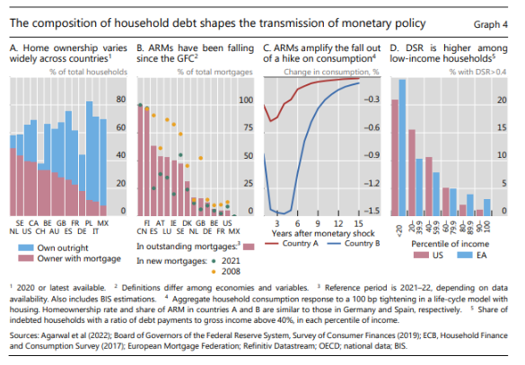 Third, the private sector's terms of borrowing are very favorable compared to other countries as well as to past decades. Note how ARMs amplify the effect that interest rate hikes have on consumption as seen in chart C of the second graph.