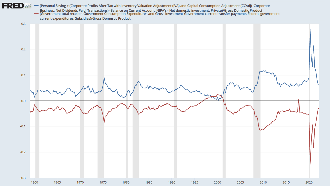 The household dissaving is primarily just a transfer to business profits, however. Corporate profit margins reached 70-year highs as they benefited first from their own stimulus packages and then from consumers overspending.