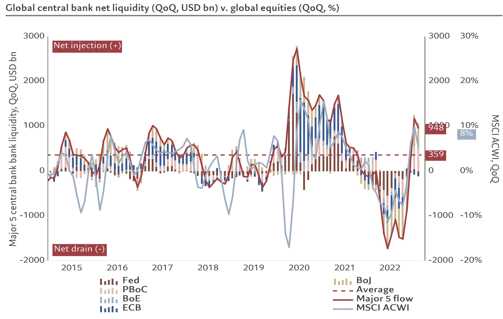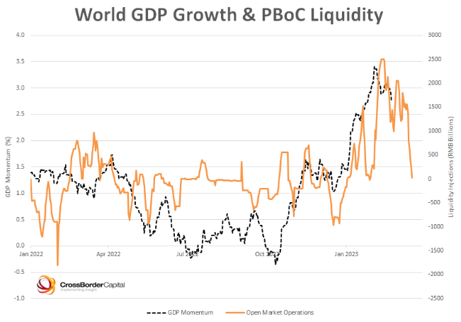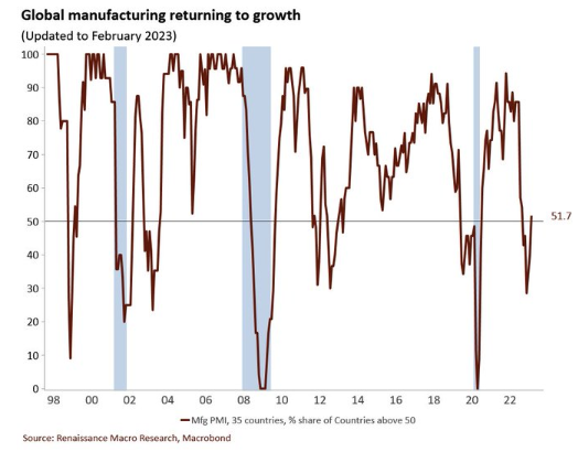 The liquidity injections helped resuscitate economic growth as the chart showing Chinese open market operations and global GDP momentum indicates. A majority of countries' manufacturing output are now expanding, up from 30% when liquidity bottomed. A warm winter in Europe saved the EU economies from Armageddon and China's dramatic return from the zero-COVID lockdowns led them to post fantastic manufacturing numbers (1, 2). Meanwhile, the US economy keeps chugging along. Anyone calling for an immediate recession had to cover their tracks.