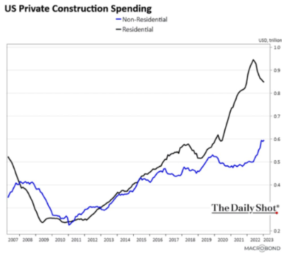 In fact, non-residential construction spend has already ticked up, wholly offsetting the decline in residential spend. Maybe that's a catch up to trend that will promptly peter off or maybe that's the start of a new secular, Congressionally-fueled trend capable of sustaining construction activity through what would otherwise be a recession.