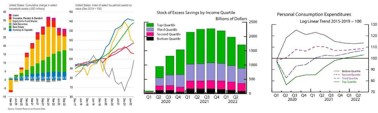 As time goes on from the moment the stimulus hit, the lowest income quintile with the highest MPCs spends all of their excess savings first, at which point those savings have been transferred to the wealthier 90%. Then, the next quintile exhausts all of theirs, and so on. In this way, the excess savings gradually trickle up the MPC gradient towards the wealthiest people who spend the least out of their earnings. A recent study explores this process.
