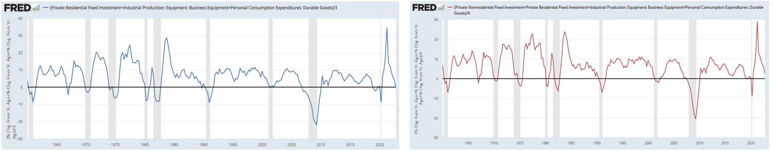 Next, rate-sensitive expenditures aside from housing – like business equipment and durable goods – have also collapsed. EPBResearch collectively calls these types of items the "high powered" segments of the economy, because he believes they drive its cyclicality. I couldn't find many good, recent academic studies that analyze whether they systematically lead the broader economy. However, multiple studies confirm that durable goods and business equipment are both highly correlated with the broader economy and exhibit 2.8x and 3.3x its volatility, respectively. Thus, EPB's claim has support from the fact that these items' volatility and correlation profiles are similar to those of housing, their sensitivity to the economic cycle makes clear intuitive sense, and the eye-ball test gives it a thumbs up with respect to timing: