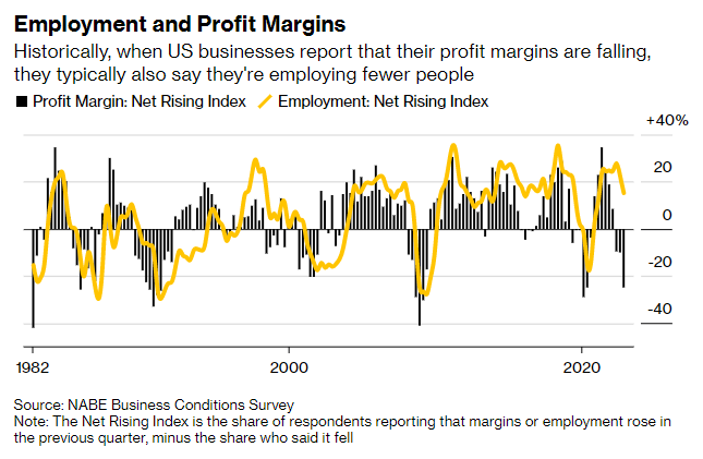 Meanwhile, the latter fact that real wages may soon be positive means that consumers could keep spending without actively dissaving or taking on debt to do so. The flip side of that is it increases the real costs for firms, which may lay people off as they see their bottom line get squeezed. This dynamic is shown below. The end of free money re-instills tension between employers and employees, between spenders and producers. Choices must be made.