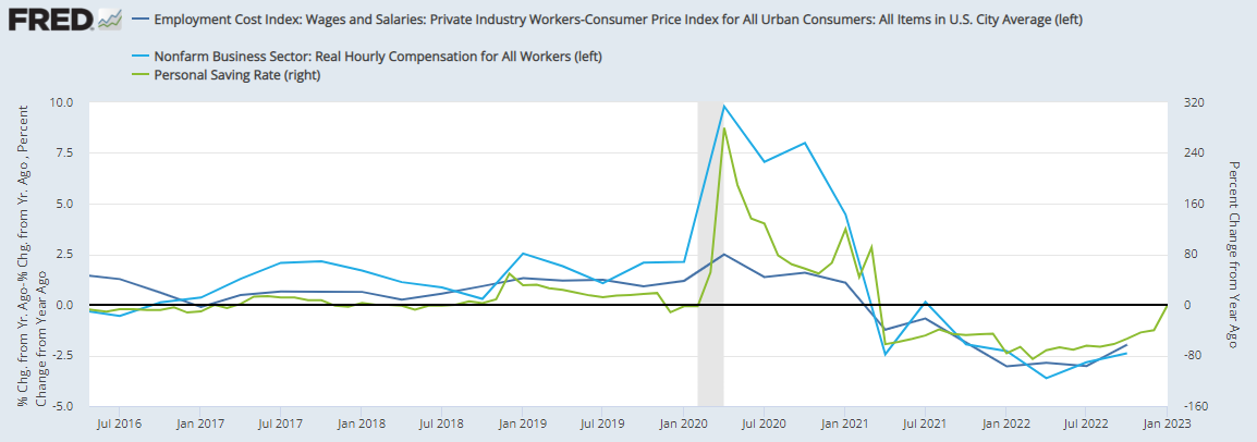As these processes whittle away at the money circulating in the private economy, an interesting dynamic is now emerging: consumers are nearing both the end of the free cash they got handed and a return to positive real wage growth as inflation subsides. The former unequivocally reduces spending prospects. And, as said above, the lower and middle classes who spend their savings first are the first to feel the pain. Earnings calls give an indication of this. Consumers at places like Nordstrom Rack and Dollar Tree have become increasingly conscious of their spending, while the luxury brands keep chugging along. Similarly, the Uber CEO said that: "The labor environment feels looser for us. 70% of drivers are saying that they're coming onto the platform because of some of the inflationary effects that they're feeling, they need to augment their earnings."