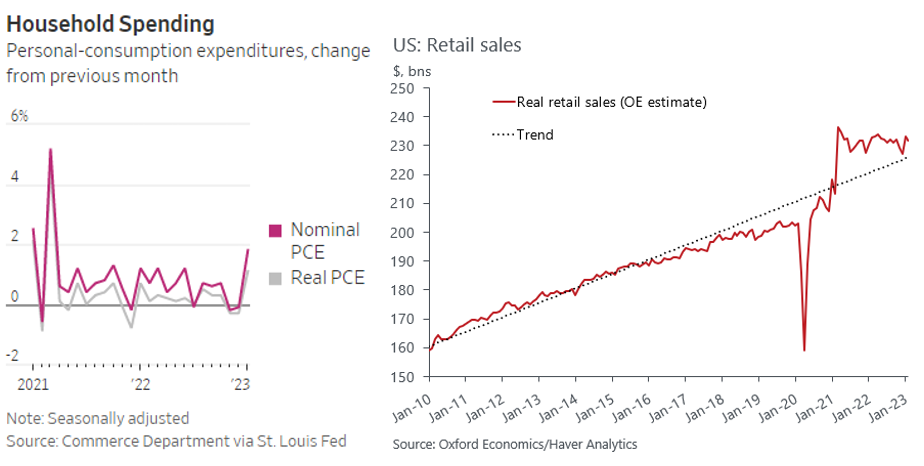 One can see from the charts above and from Visa's Spending Momentum Index that spending cooled off towards the end of 2022, and then proceeded to gap upwards in January. This can be partially explained by a rebound from a cyclically weak December, but likely more so due to manipulation from an unusually strong flu season and to increased social benefits being distributed. Half the states had an annual bump to minimum wage hit in January, though roughly only 1.5% of workers or 2M people are below their state's threshold. The bigger ticket item is Social Security checks being adjusted for inflation by +9% and sent to 70M people. That’s +$140 a month or $1680 a year for 70 million Americans.