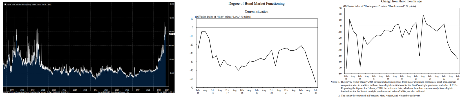The situation, of course, was even more funky in Japan. On several occasions throughout the fall, full days went by with zero trading of JGBs, even on days when auctions were being held... and that's on an $11T market. The record was set at five consecutive days without a single dollar traded. This ghost town in trading was made possible by the combination of the BoJ's promise to buy an infinite amount of JGBs to maintain yield curve control and the fact that it already owned over 50% of all issuance and nearly 90% of the benchmark 10-year bond. In the same fashion as the UST market, the illiquidity caused bid-ask spreads to blow out, volume of orders at best-ask price to plummet, and price impacts to jolt up (link). The charts below show aggregated measures of this mayhem.