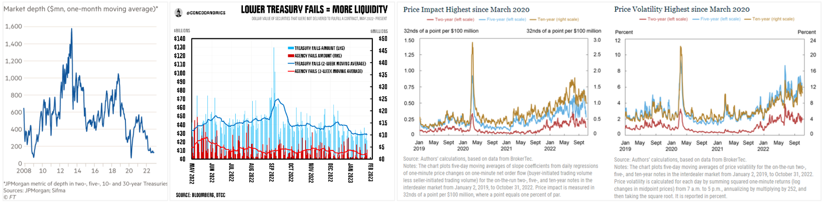 Over the course of 2022, the non-economic buyers of Treasuries increasingly stepped away. When September rolled around, we found out what happens when the non-economic buyers turn into net sellers. Widespread market disfunction ensued as USTs offered economic buyers deeply negative real rates. Trade fails skyrocketed, market depth shrunk to levels seen only during the GFC & COVID, and the price impact & volatility of that illiquidity rose steadily for months.