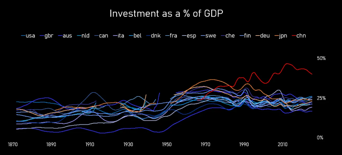 A key starting point is that China's economic growth rate is a pre-determined input decided by politicians at the beginning of the year, not an end-of-year measurement of output like in every other country. If productive, demand-driven growth cannot fulfill that quota, the local governments will build more buildings until the target is reached. That's resulted in China's "investment" rate being higher than any country in history for the last 30 years, accounting for 30-50% of GDP and peaking at 1.5x Japan's max in 1970. Similar to Japan, much of that went into deeply wasteful projects, most wasteful of all was real estate. PIIE estimates that the property sector accounts for 25-30% of GDP.