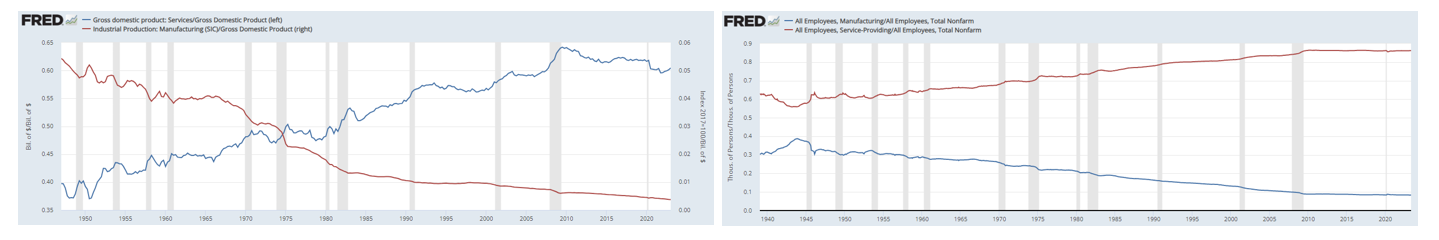 In addition to the population's financial health specific to this cycle, the economy's limited responsiveness to rate hikes should also be understood in the context of the four-decade-long decline in the economy's sensitivity to interest rates, driven in large part by a re-structuring of both output and employment towards industries less sensitive to cycles: